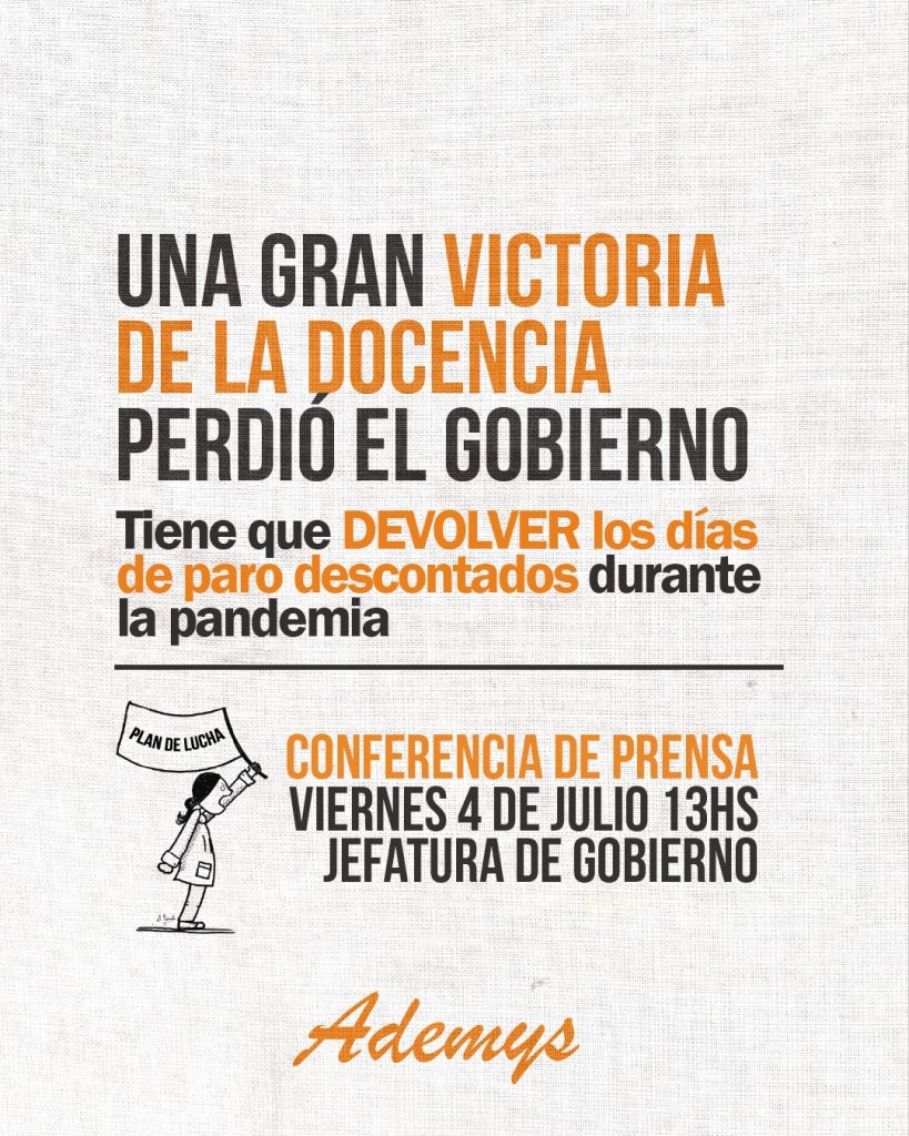La Justicia Laboral ordenó al Gobierno de la Ciudad de Buenos Aires devolver a los docentes los descuentos por las Huelgas convocados por Ademys en el contexto de la Pandemia del COVID-19.